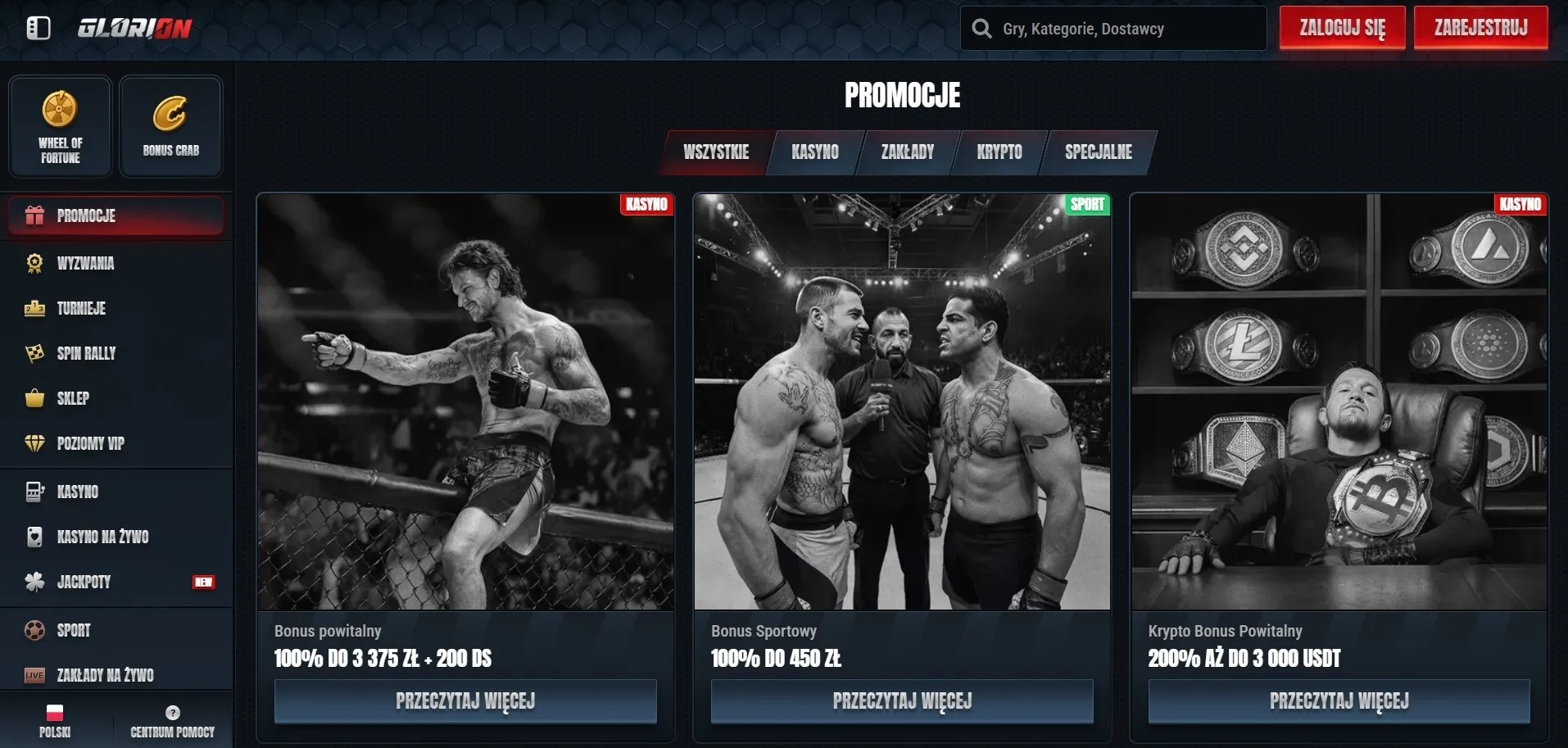 Bonus powitalny w Glorion casino wynosi 270% do 6000 zł oraz 470 darmowych spinów. Aktywacja wymaga minimalnego pierwszego depozytu w wysokości 90 zł. To jeden z wyższych pakietów startowych dostępnych dla polskich graczy w 2026 roku.