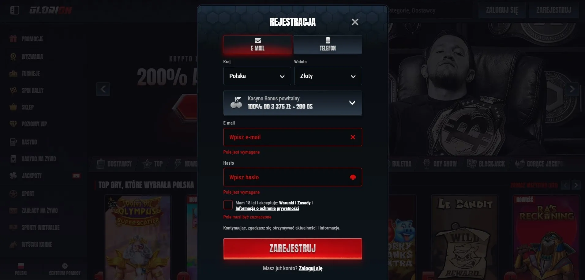 Formularz rejestracyjny w Glorion kasyno jest krótki. Potrzebny jest aktywny adres e-mail lub numer telefonu oraz wybór waluty – i to właściwie wszystko na start.