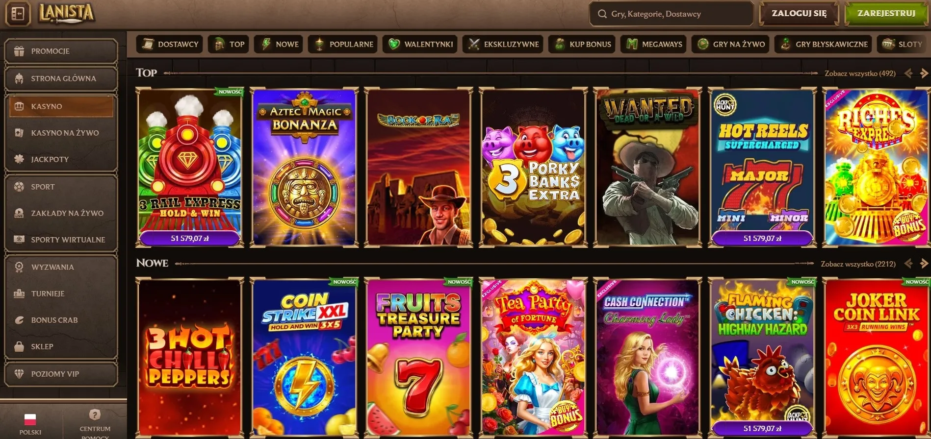 Biblioteka Lanista casino online liczy ponad 5000 tytułów od niemal 100 studiów deweloperskich. To naprawdę szeroka oferta – znajdziemy tu klasyczne automaty, gry z jackpotem progresywnym, sloty z mechanizmem Megaways, tytuły z opcją kupna bonusa, a także stołowe i błyskawiczne. Każdy tytuł można wypróbować w trybie demo bez wydawania własnych środków, co jest dużą zaletą dla graczy testujących nowe mechaniki.