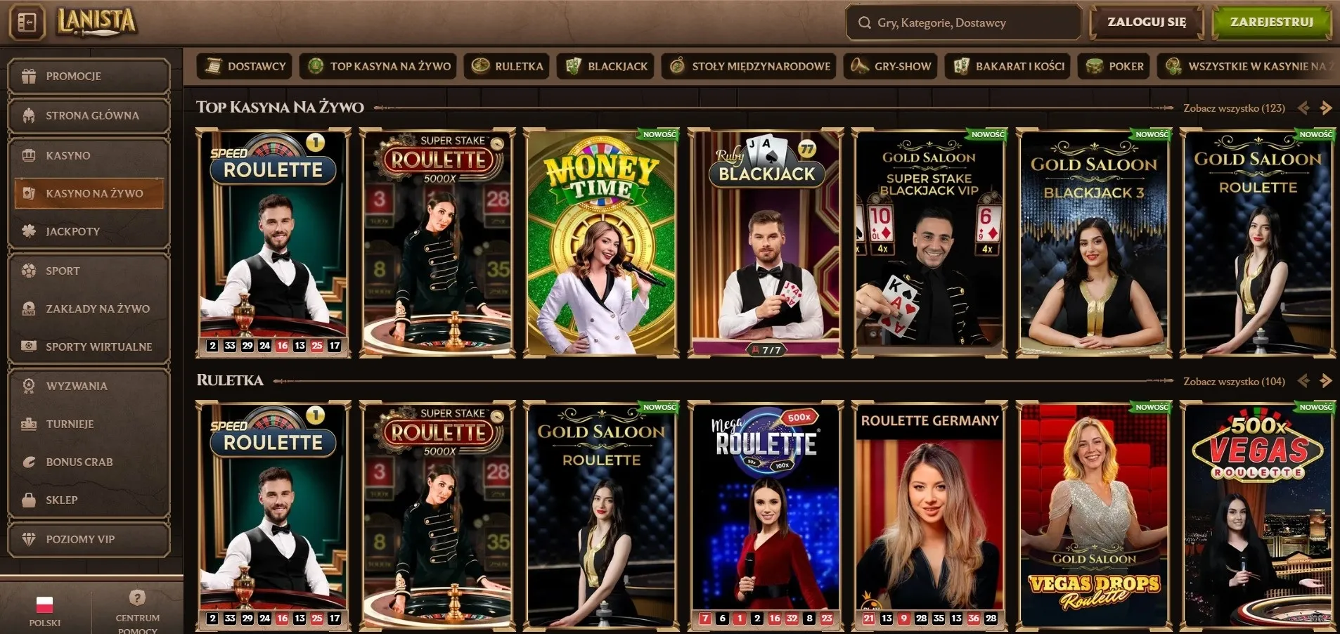 Sekcja na żywo obejmuje klasyki – baccarat live, ruletka europejska, blackjack – oraz show-gry takie jak Crazy Time czy Mega Ball. Transmisje prowadzone są w wysokiej rozdzielczości, a krupierzy obsługują graczy po polsku i angielsku. Przy stołach VIP dostępne są wysokie limity stawek, natomiast gracze z mniejszym budżetem znajdą warianty z minimalnymi zakładami. Dodatkowo Lanista kasyno oferuje zakłady sportowe z kursami na popularne ligi i dyscypliny z całego świata.
