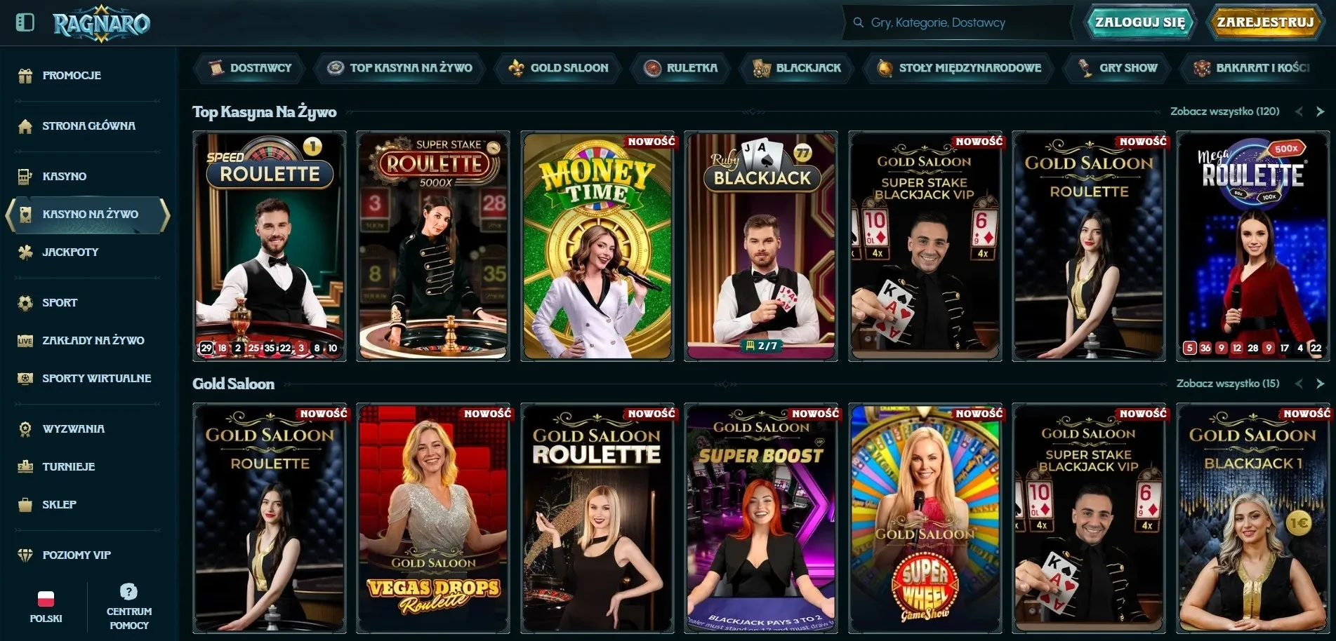 Live casino w Ragnaro opiera się na transmisjach HD z profesjonalnych studiów. Stół z prawdziwym krupierem, kamera w dobrej rozdzielczości i możliwość rozmowy przez czat na żywo – to zupełnie inne doświadczenie niż gra na standardowym slocie. W ofercie jest m.in. Speed Roulette, Super Stake Roulette 5000x z wysokimi mnożnikami, kilka wariantów blackjacka – Gold Saloon Blackjack i Super Stake Blackjack VIP – a także Vegas Drops Roulette i koło fortuny transmitowane żywo. Możliwość gry z prawdziwym krupierem doceniają szczególnie gracze, którzy znają realia stacjonarnych kasyn.