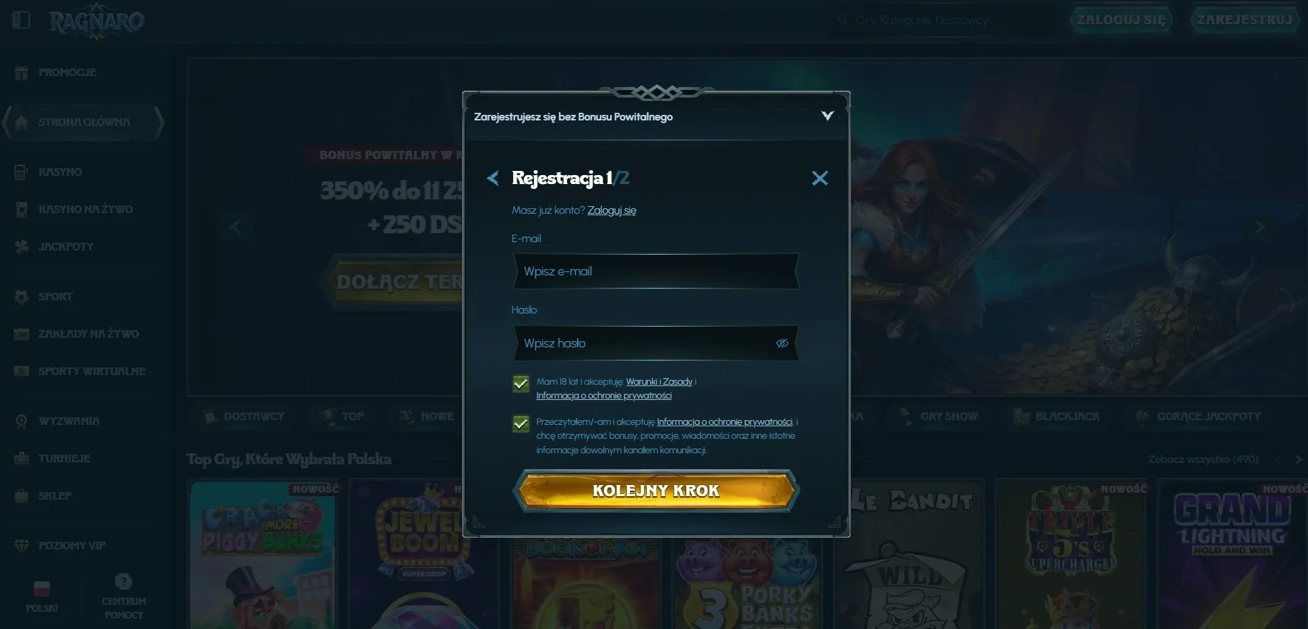 Rejestracja składa się z dwóch kroków i zajmuje dosłownie kilka minut. Najpierw wpisujesz adres e-mail i tworzysz hasło, potem uzupełniasz dane: imię, nazwisko, datę urodzenia, numer telefonu z prefiksem +48 i adres zamieszkania. Na tym etapie jest też pole na Ragnaro kod promocyjny – opcjonalne, ale warto o nim pamiętać, jeśli taki posiadasz. Ragnaro logowanie po rejestracji to już kwestia kilku sekund – e-mail, hasło, gotowe.
