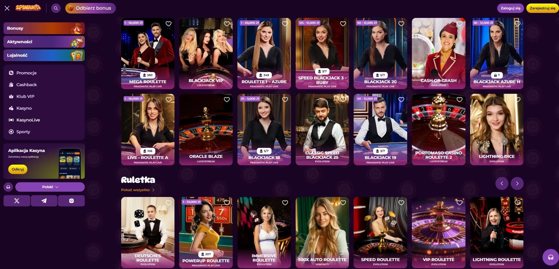 Sekcja live casino to kolejny atut platformy. Transmisje prowadzone są w jakości HD ze studiów Evolution i Pragmatic Play Live, co zapewnia autentyczną atmosferę zbliżoną do kasyn stacjonarnych. Gracz może rozmawiać z krupierem przez czat na żywo i obserwować rozgrywkę w czasie rzeczywistym.