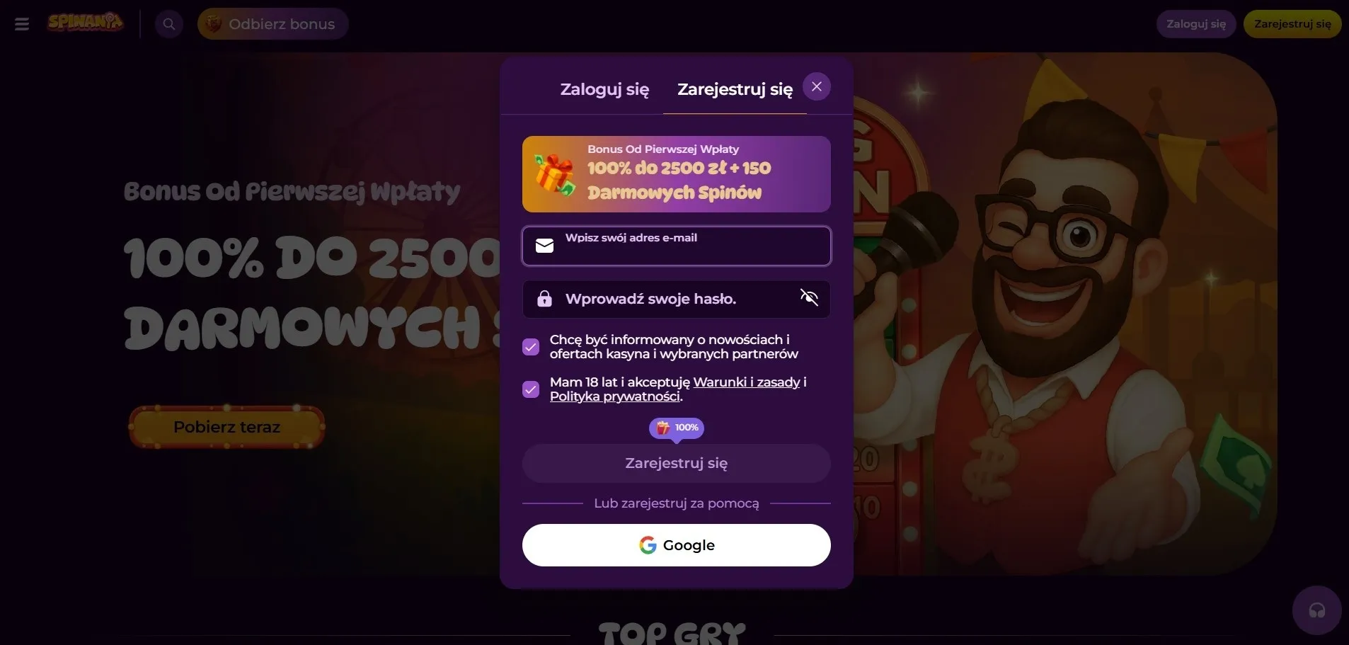 Podaj adres e-mail i ustaw hasło do konta – system automatycznie wyświetli dostępny bonus powitalny.
