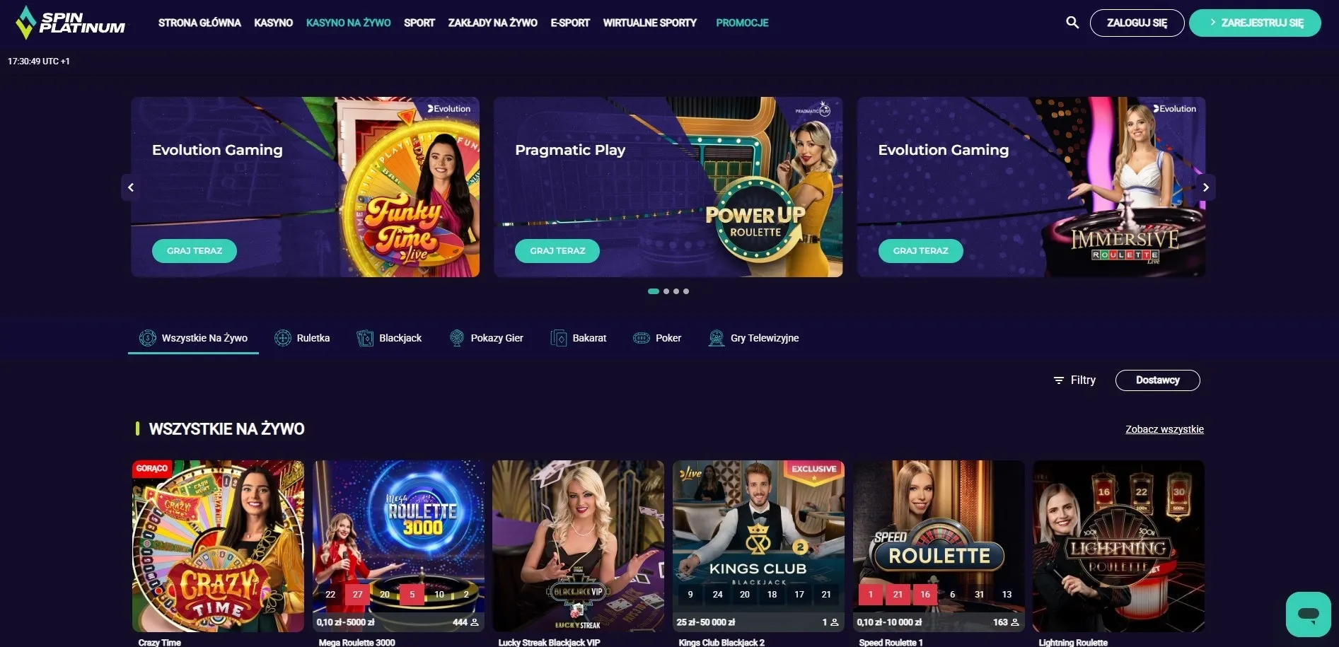 SpinPlatinum kasyno na żywo to ponad 240 gier obsługiwanych przez prawdziwych krupierów. Głównym dostawcą tej sekcji jest Evolution Gaming, który uchodzi za standard jakości w branży live casino. Do dyspozycji graczy są klasyczne stoły ruletki, blackjacka, bakarata i pokera, a także formaty inspirowane teletunierjami.